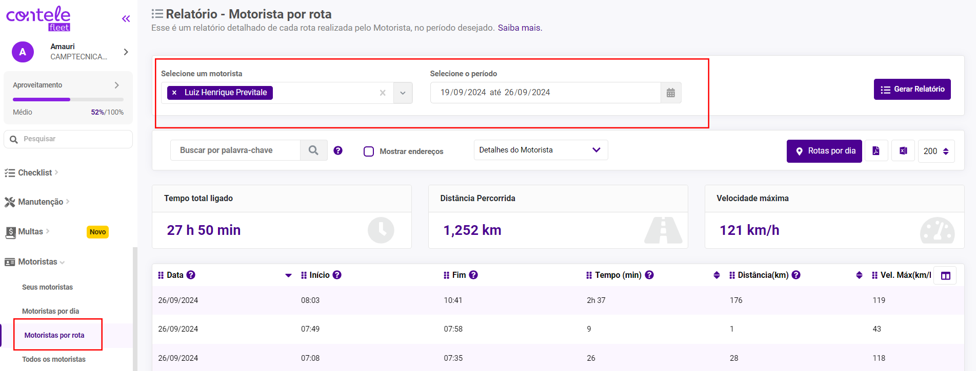 O Relatório do Motorista (por rota) é um relatório detalhado que exibe cada rota realizada pelo motorista, com informações como o tempo de condução, distância percorrida e velocidade máxima, dentro de um período selecionado.