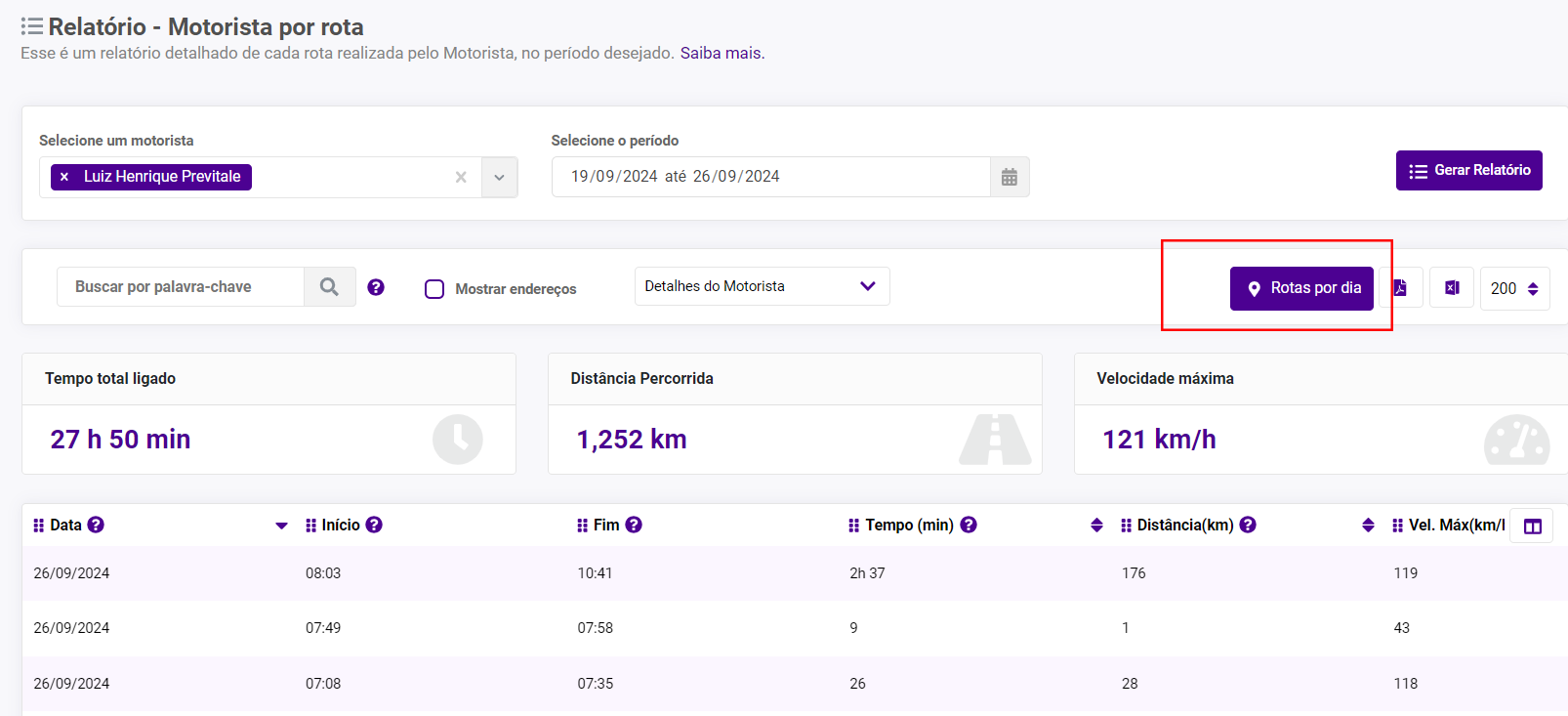É possível selecionar a opção de ver as rotas por dia, onde todas as rotas do motorista realizadas no mesmo dia serão exibidas de forma agrupada.